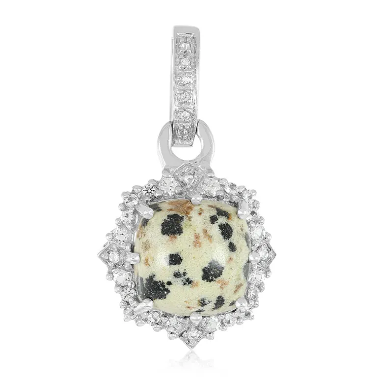 Dieser handgefertigte Anhänger besticht durch seinen gefleckten Charme und verkörpert die einzigartige Schönheit des Amerikanischen Dalmatiner-Jaspis mit einem Gewicht von 7,61 Karat, der in einem antiken Kissen-Cabochon gefasst ist. Umgeben von einem Halo aus 22 schimmernden weißen Topas-Steinen aus Brasilien mit einem Gesamtgewicht von 0,593 Karat, fängt dieses Schmuckstück die verspielte Essenz seines Namensgebers ein. Der Anhänger aus 925er Sterlingsilber mit einem Gewicht von ca. 3,9 Gramm misst beeindruckende 34 x 19 mm und ist ein echter Blickfang für jedes Outfit. Dieser Anhänger ist ideal, um im Alltag Akzente zu setzen oder der Abendgarderobe einen skurrilen Touch zu verleihen und sorgt für Gesprächsstoff.
