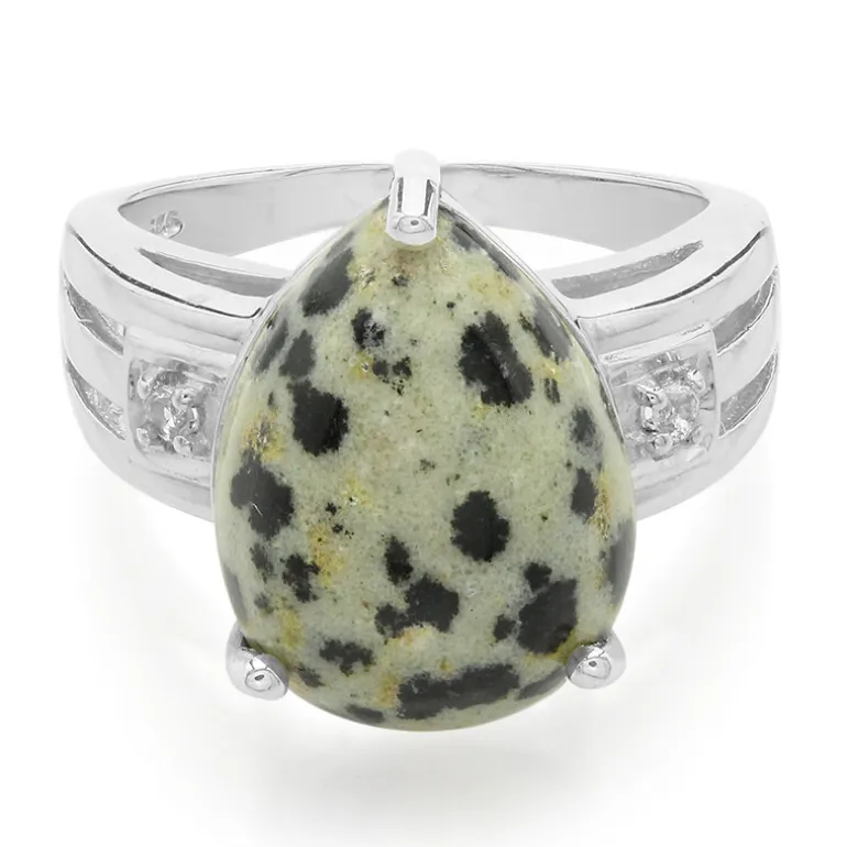 Entdecken Sie den einzigartigen Charme dieses Rings aus geflecktem dalmatinischem Jaspis mit einem 8,69 Karat großen, tropfenförmigen Cabochon, der in 925er Sterlingsilber gefasst ist. Mit seinem gesprenkelten Muster, das an das kultige Fell des Dalmatiners erinnert, ist dieses Schmuckstück ein echter Hingucker. Akzentuiert durch zwei weiße Topase aus Brasilien, ist es eine perfekte Mischung aus Laune und Klasse. Dieser Ring eignet sich sowohl für zwanglose Ausflüge als auch für elegantere Anlässe und ergänzt Ihre Lieblingsoutfits mit seiner monochromen Farbpalette und einem Hauch von Brillanz.