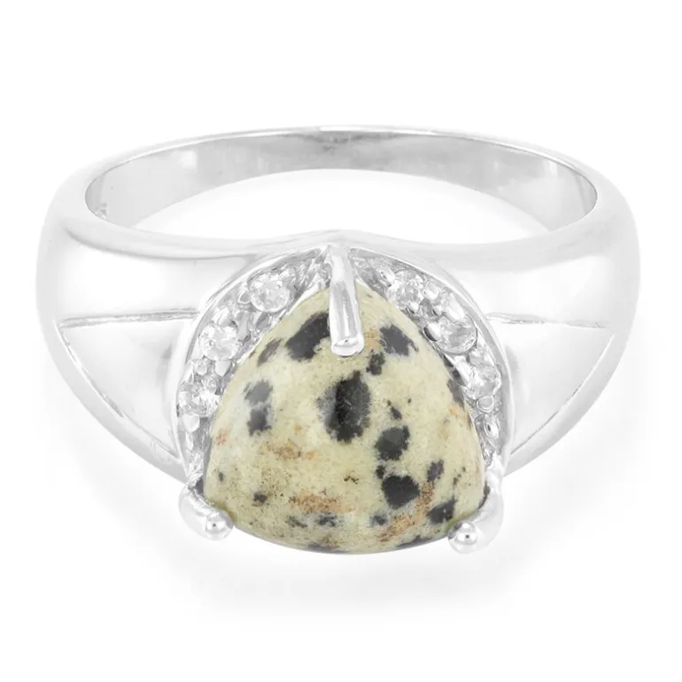 Entdecken Sie die Eleganz dieses atemberaubenden Rings aus dalmatinischem Jaspis aus den USA, gefasst in 925er Sterlingsilber. Der 3,18-karätige Trilliant-Cabochon wird durch neun schillernde kambodschanische Zirkone von insgesamt 0,212 Karat charmant ergänzt. Dieser Ring verkörpert zeitlose Eleganz und eignet sich für jeden Anlass, ob er nun ein Freizeitoutfit schmückt oder ein formelles Ensemble ergänzt.