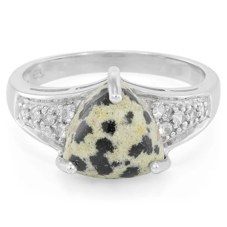Dieser einzigartige Ring zeigt einen auffälligen Dalmatiner-Jaspis im Trillant-Cabochon-Schliff von 3,58 Karat aus den USA, kunstvoll gefasst in poliertem 925er Sterlingsilber. Der verspielte, schwarz-weiß gemusterte Edelstein wird durch 10 kambodschanische Zirkon-Akzente von insgesamt 0,237 ct mit brillantem Rundschliff ergänzt, die für zusätzliches Funkeln sorgen. Das Silberband wiegt ca. 2,79 g und garantiert einen bequemen und sicheren Sitz. Dieser Ring eignet sich perfekt, um jedem Ensemble einen Hauch von raffinierter Laune zu verleihen, und ist ideal für das tägliche Tragen oder besondere Anlässe.