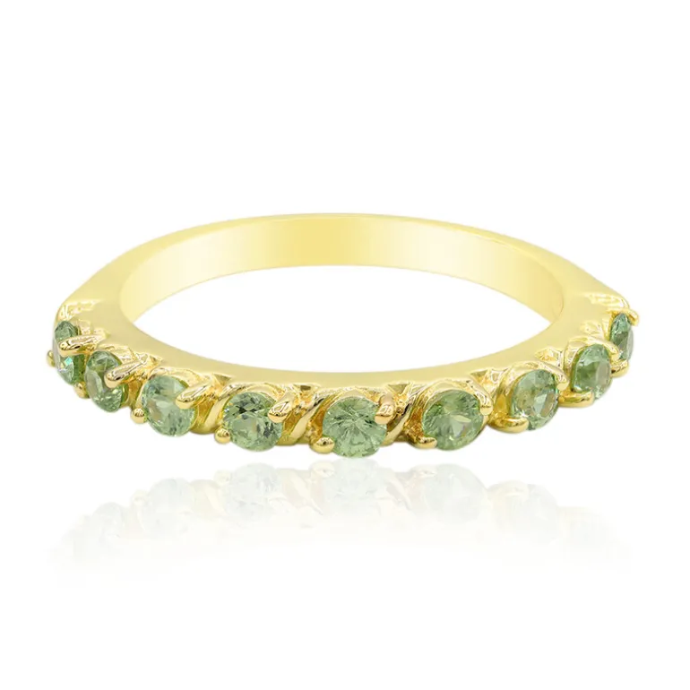 Dieser Ring aus 9-karätigem Gold mit rund geschliffenen Edelsteinen von insgesamt 0,65 Karat stellt die Faszination des Madagaskar-Demantoids vor und strahlt Eleganz aus. Die 2,77 g Feingold bilden einen atemberaubenden Hintergrund für die leuchtend grünen Steine, die in einem harmonischen Kreis angeordnet sind. Dieser Ring von Adela Gold eignet sich sowohl für den Alltag als auch für besondere Anlässe und passt mit seiner zeitlosen Ausstrahlung sowohl zu legeren als auch zu formellen Anlässen.