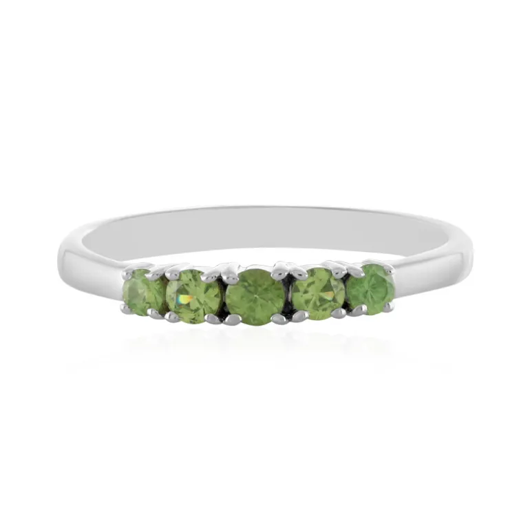 Entdecken Sie die Faszination dieses schicken Rings aus 925er Sterlingsilber, gekrönt von einer Kollektion glänzender Demantoid-Edelsteine aus Madagaskar mit insgesamt 0,477 Karat. Die Steine im Rundschliff strahlen in einem leuchtenden Grünton und sind so gefasst, dass sie bei jeder Bewegung das Licht einfangen. Mit seinem schmalen, eleganten Band ist dieses Schmuckstück eine vielseitige Ergänzung für jede Schmucksammlung, perfekt für den Übergang von Tag zu Abend. Kombinieren Sie es mit einer frischen weißen Bluse oder einem luxuriösen Abendkleid, um das leuchtend grüne Funkeln in den Mittelpunkt zu stellen.