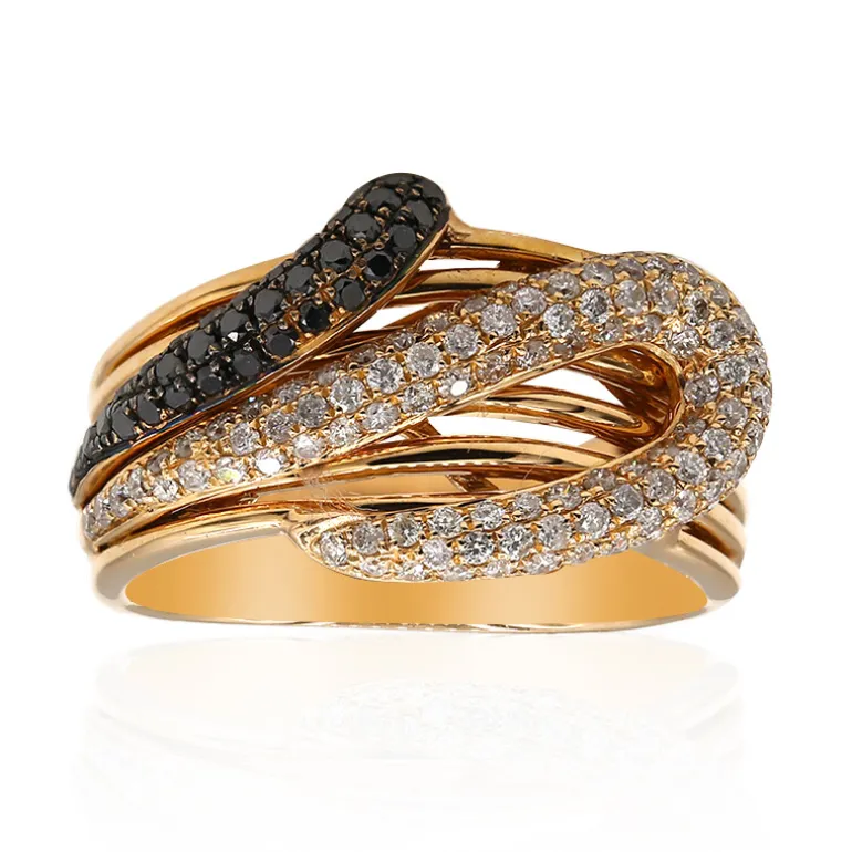 Diese atemberaubende Kreation von CIRARI zeigt ein aufwendiges, ineinander verschlungenes Design, das mit 37 schwarzen Diamanten von insgesamt 0,24 ct und 108 weißen Diamanten von 0,7 ct (I1 (H)) besetzt ist. Der Ring ist in 18 Karat Roségold gefasst und wiegt ca. 6,3 g. Die kontrastierende Brillanz der schwarzen und weißen Diamanten bietet einen raffinierten visuellen Reiz und macht diesen Ring zu einem fesselnden Statement-Stück. Er eignet sich perfekt für gehobene Anlässe oder als luxuriöse Ergänzung zu Ihrem täglichen Ensemble. Das Design dieses Rings sorgt für einen bequemen Sitz und ein kontinuierliches Funkeln aus jedem Winkel.