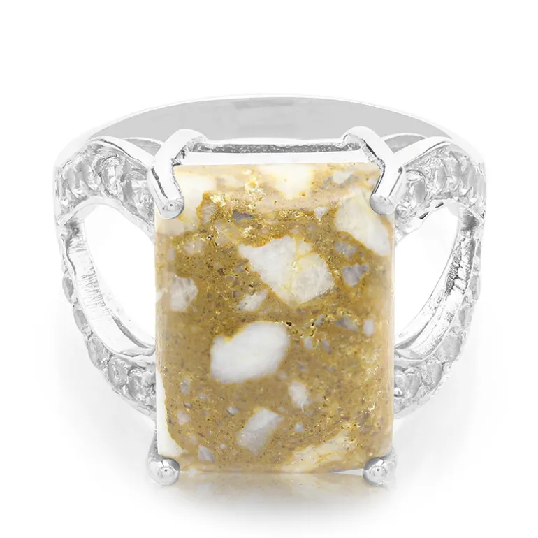 Dieser unverwechselbare Herrenring ist ein echter Gesprächsstarter. Er präsentiert einen bedeutenden Dinosaurierquarz mit einem Baguette-Cabochon von 11,17 Karat aus den USA, der von 24 weißen Topasen von insgesamt 0,967 Karat umrahmt wird. Jeder Topas funkelt mit einem brillanten Rundschliff und ergänzt den silbernen Glanz des 925er Sterlingsilberbandes, das etwa 4,5 Gramm wiegt. Der Ring mit den Maßen 33×23 mm besitzt einen robusten und maskulinen Charme, der ihn zu einem idealen Accessoire sowohl für die Freizeit als auch für die formelle Garderobe macht.