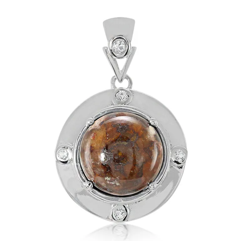 Entdecken Sie die uralte Schönheit dieses Silberanhängers aus Dinosaurierquarz mit einem runden Cabochon von 4,69 Karat aus den USA, der von einem brasilianischen weißen Topas akzentuiert wird. Eingefasst in elegantes 925er Sterlingsilber, kombiniert dieses Stück Raffinesse mit einem Hauch von Erdgeschichte. Es ist ideal für den täglichen Gebrauch oder für besondere Anlässe und passt sowohl zu legeren als auch zu formellen Outfits.