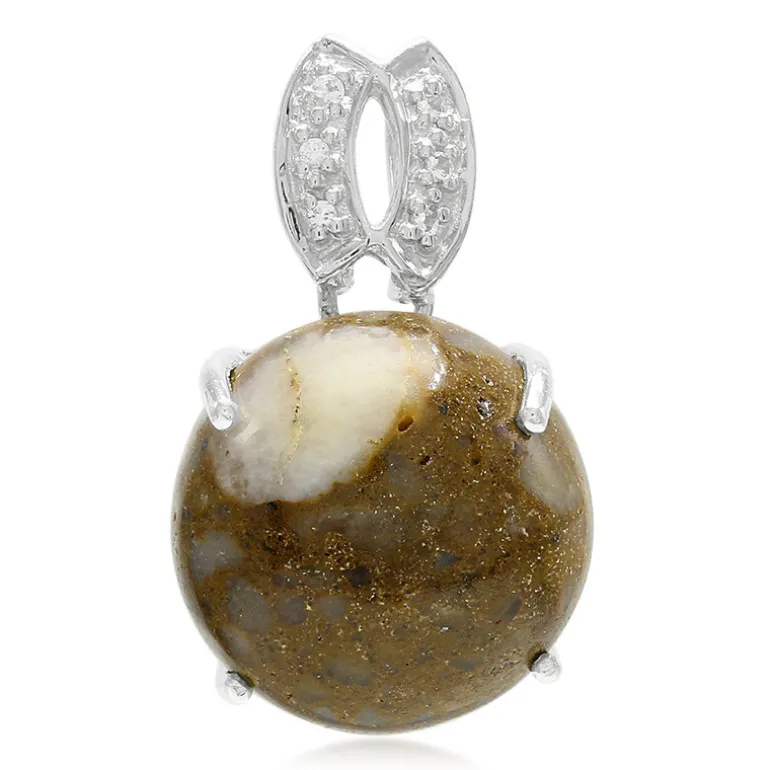 Entdecken Sie die Anziehungskraft prähistorischer Eleganz mit diesem Dinosaurier-Quarz-Anhänger, der einen fesselnden runden Cabochon von 10,47 Karat aus den USA enthält. Er ist in 925er Sterlingsilber gefasst und wird von sechs funkelnden weißen Topasen aus Brasilien akzentuiert. Dieses einzigartige Stück verleiht sowohl legeren als auch formellen Outfits einen Hauch von antikem Charme und ist ideal für alle, die unverwechselbare und mutige Schmuckstücke zu schätzen wissen.
