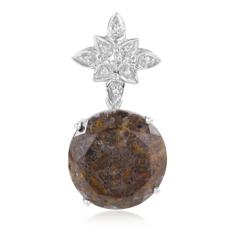 Entdecken Sie die prähistorische Anziehungskraft dieses Anhängers aus Sterlingsilber mit einem fesselnden Dinosaurierquarz im Rundschliff von 7,75 Karat aus den USA. Die organischen Muster des Edelsteins erinnern an antike Lebensformen und bringen einen Hauch von Geschichte in Ihre Sammlung. Mit funkelnden weißen Topasen aus Brasilien und Zirkonen aus Kambodscha verbindet der Anhänger auf elegante Weise die Vergangenheit mit der Gegenwart. Das 27 x 13,5 mm große Schmuckstück in Erbstückqualität eignet sich ideal als einzigartiger Gesprächsstoff in Ihrer Garderobe oder als Geschenk für jemanden, der die Kunstfertigkeit der Natur zu schätzen weiß.