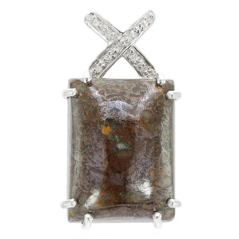 Entdecken Sie die Essenz prähistorischer Schönheit mit diesem außergewöhnlichen Dinosaurierquarz-Anhänger aus den USA. Mit einem 19,57 Karat großen Stein im Baguetteschliff, gefasst in hochwertigem 925er Sterlingsilber, verkörpert dieser Anhänger die Zeit in seinem organischen Muster. Ergänzt durch eine Reihe von neun funkelnden Zirkonen aus Kambodscha, erzählt dieser Anhänger nicht nur eine Geschichte, die Millionen von Jahren zurückliegt, sondern verleiht auch jedem Outfit einen Hauch von Eleganz. Er eignet sich sowohl für zwanglose Treffen als auch für gehobene Anlässe und wird die Neugierde der Betrachter auf sich ziehen.