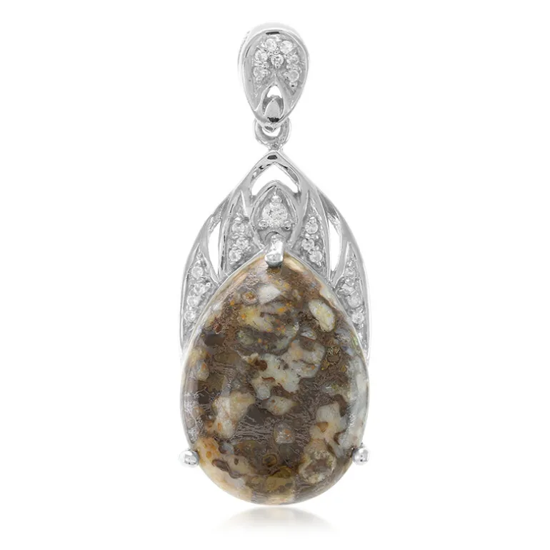 Entdecken Sie die prähistorische Anziehungskraft dieses einzigartigen Dinosaurierquarz-Anhängers aus den USA, der 14,34 Karat antiker Schönheit in einem tropfenförmigen Cabochon enthält. Umgeben von einer Konstellation aus 21 funkelnden runden Zirkonen aus Kambodscha, verbindet dieses Stück aus 925er Sterlingsilber Antike mit moderner Handwerkskunst. Mit einem Gewicht von ca. 3,91 Gramm ist er sehr präsent, ohne überwältigend zu wirken. Er eignet sich perfekt, um Ihrem Ensemble einen Hauch von historischer Faszination zu verleihen und sorgt für Gesprächsstoff bei jeder Gelegenheit.