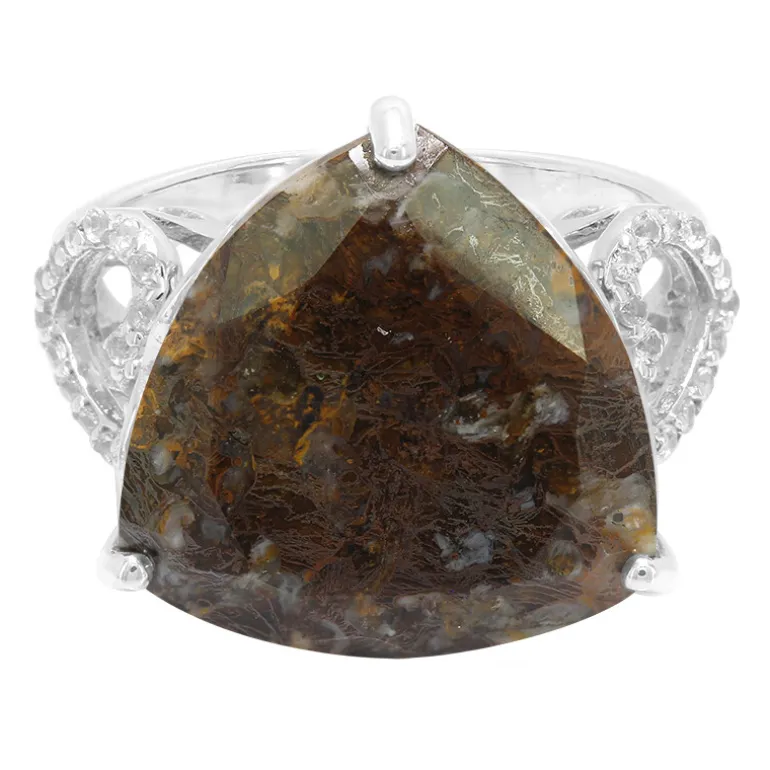 Dieser atemberaubende Silberring präsentiert einen faszinierenden Dinosaurierquarz im Trillantschliff von 10,35 Karat aus den USA, eingefasst in funkelnde weiße Topase von insgesamt 0,221 Karat aus Brasilien. Der aus 925er Sterlingsilber gefertigte Ring hat ein Gesamtkaratgewicht von 10,571 ct. Sein einzigartiger großer Edelstein, der an antike Naturwunder erinnert, macht ihn zu einem Gesprächsthema für jeden Anlass. Die filigranen Details auf dem Ring verleihen ihm einen Hauch von Raffinesse. Er eignet sich perfekt als Accessoire für ein formelles Outfit oder verleiht einem legeren Look ein elegantes Flair.