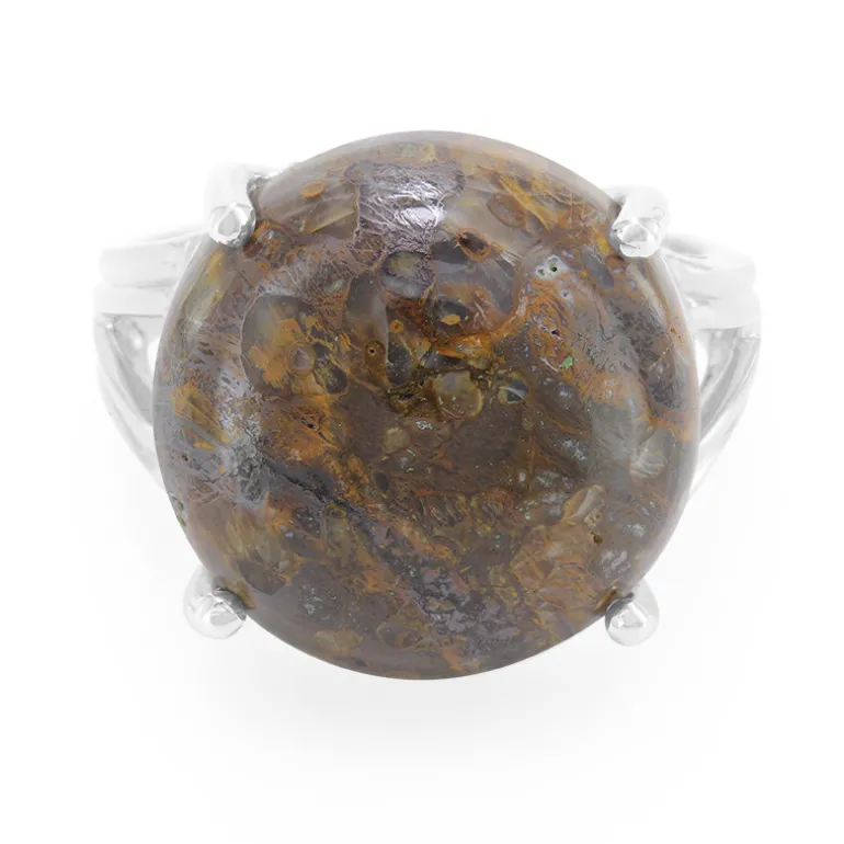 Tauchen Sie ein in die Welt der Antike mit unserem einzigartigen Dinosaurierquarz-Ring. Dieses exquisite Stück zeigt einen atemberaubenden runden Cabochon von 12,19 Karat, der reich an Geschichte ist und anmutig in 925er Sterlingsilber gefasst wurde. Die faszinierenden Muster im Inneren des Edelsteins strahlen einen zeitlosen Charme aus und sind perfekt, um Ihrem Ensemble einen Hauch von Faszination zu verleihen. Dieser Ring ist ideal für Geschichtsinteressierte und Stilliebhaber gleichermaßen und wird bei jeder Veranstaltung für Gesprächsstoff sorgen.