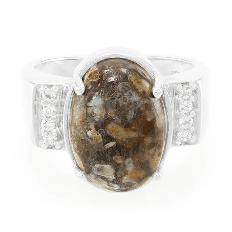 Tauchen Sie ein in die Antike mit diesem prähistorischen Dinosaurier-Quarz-Ring in glänzendem 925er Sterling Silber. Mit einem unverwechselbaren ovalen Cabochon von 6,19 Karat, umgeben von acht funkelnden weißen Topasen aus Brasilien von insgesamt 0,136 Karat, verbindet dieses Stück das Geheimnis der Vergangenheit mit moderner Eleganz. Perfekt für alle, die historischen Charme zu schätzen wissen, ist dieser Ring ein gesprächsanregendes Accessoire für zwanglose Zusammenkünfte oder thematische Veranstaltungen.