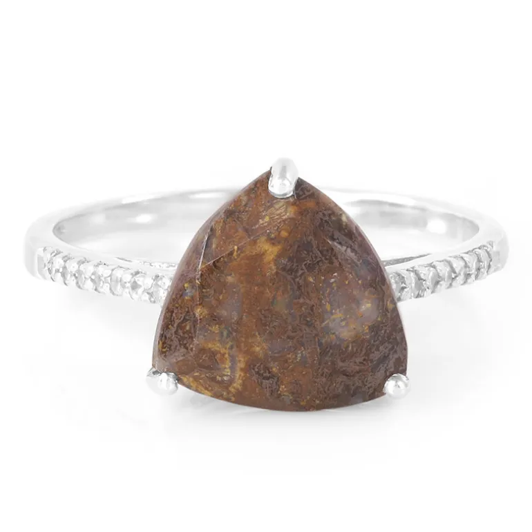 Entdecken Sie die uralte Anziehungskraft unseres Rings mit Dinosaurier-Quarz aus den USA. Der Edelstein im Trillant-Schliff strahlt zeitlosen Charme aus. Der schokoladenbraune Quarz von 2,27 Karat wurde fachmännisch facettiert, um seine einzigartigen, natürlichen Einschlüsse zu präsentieren, die an die ursprünglichen Landschaften der Erde erinnern. Umgeben von kambodschanischen Zirkon-Akzenten von insgesamt 0,119 Karat, wiegt dieser Schatz aus Sterlingsilber etwa 1,26 g und verleiht jedem Ensemble einen Hauch prähistorischer Raffinesse. Dieser Ring ist ideal für besondere Anlässe oder die Eleganz des Alltags. Er sorgt für Gesprächsstoff und ist ein Zeugnis für die Schönheit der Natur.