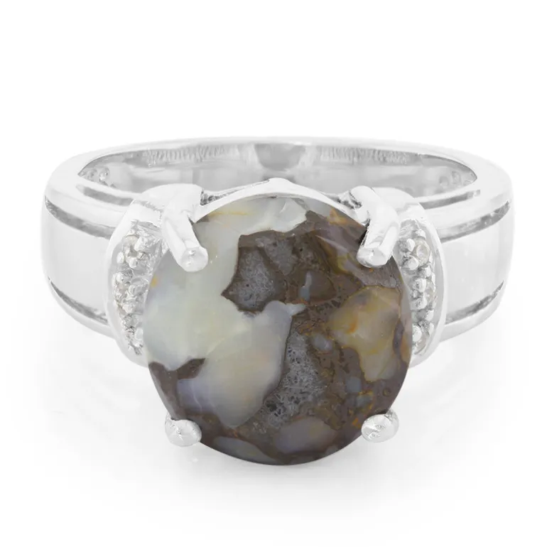 Entdecken Sie die bezaubernde Schönheit der Vergangenheit mit diesem Ring aus Dinosaurierquarz aus den USA. Mit einem faszinierenden 5,37 Karat Rundschliff in der Mitte ist er ein zeitloser Schatz, der für moderne Eleganz entworfen wurde. Eingebettet in 925er Sterlingsilber mit sechs funkelnden kambodschanischen Zirkon-Akzenten von insgesamt 0,074ct, verbindet dieser 30×21 mm große Ring Geschichte und Stil. Er lässt sich perfekt mit Ihrem Lieblingsoutfit für einen besonderen Abend kombinieren oder ist ein faszinierendes Gesprächsthema bei gesellschaftlichen Anlässen. Entfesseln Sie Ihren inneren Paläontologen und fügen Sie Ihrer Schmucksammlung einen prähistorischen Schick hinzu.
