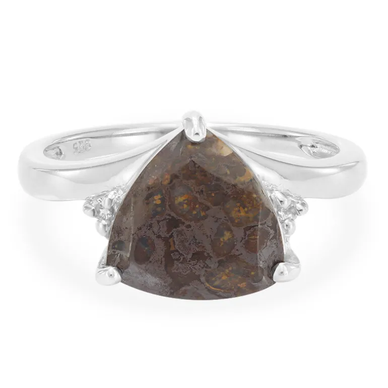 Entdecken Sie die prähistorische Anziehungskraft dieses fesselnden Dinosaurierquarz-Rings. Der aus den USA stammende 2,63-karätige Edelstein im Trillant-Schliff, der die Essenz der Zeit verkörpert, weist ein kompliziertes Muster auf, das Geschichten von der alten Erde erzählt. Er ist in den reinen Glanz von 925er Sterlingsilber eingebettet und wiegt ca. 2,01 g. Verziert mit zwei runden weißen Topasen im Brillantschliff aus Brasilien, verbindet dieses Schmuckstück Geschichte und Luxus. Er ist vielseitig einsetzbar und passt sowohl zu eleganter Abendgarderobe als auch zu legeren Tagesoutfits und ist damit eine zeitlose Ergänzung für jede Sammlung.