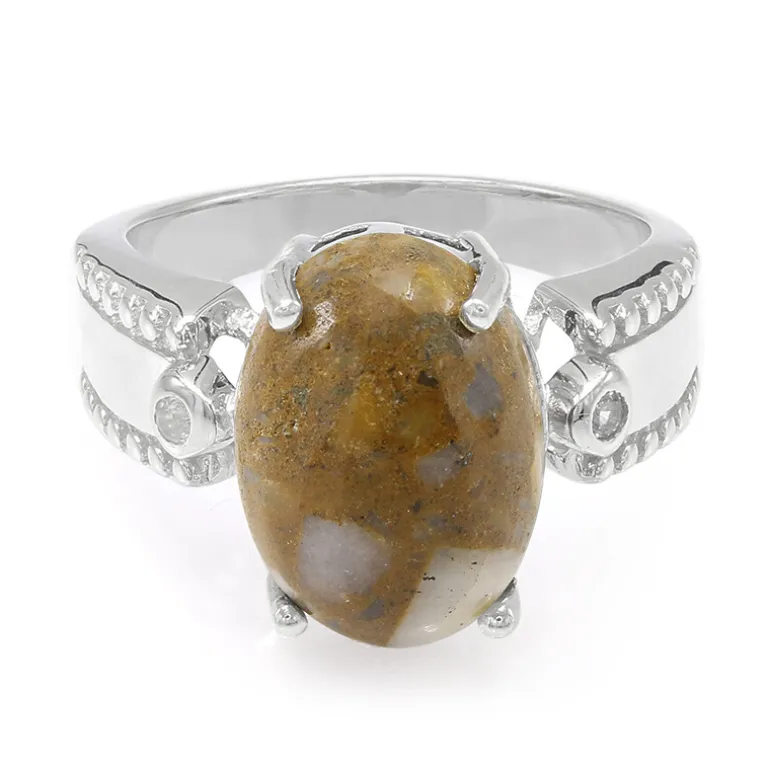 Entdecken Sie die Faszination der Geschichte mit diesem exquisiten Ring aus Dinosaurierquarz mit einem ovalen Cabochon von 5,33 Karat aus den USA. Er ist in Sterlingsilber gefasst und wird durch zwei weiße Topase im Brillantschliff aus Brasilien ergänzt. Dieses einzigartige Schmuckstück eignet sich perfekt, um Ihrem täglichen Look oder besonderen Anlässen einen Hauch von Faszination zu verleihen. Kombinieren Sie es mit erdigen Tönen oder klassischem Schwarz für ein auffälliges Ensemble.