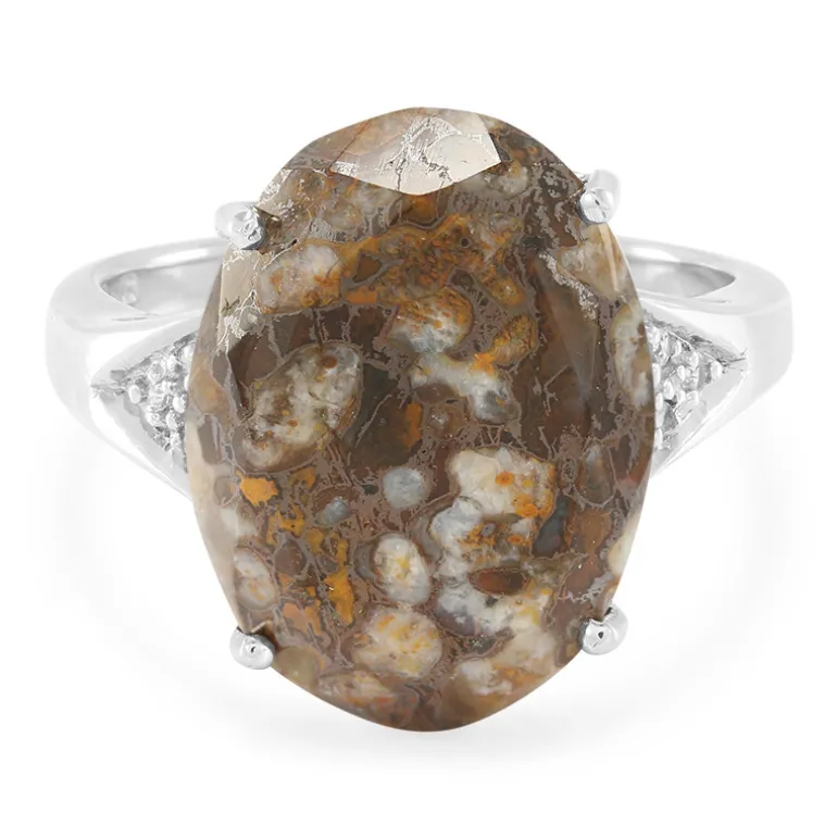 Versetzen Sie sich in die Vergangenheit mit diesem atemberaubenden Schmuckstück mit einem majestätischen Dinosaurierquarz im USA-Schliff von 8,41 Karat, dessen erdige Farbtöne und prähistorische Anklänge in einer ovalen Silhouette eingefasst sind. Geschmückt mit funkelnden weißen Topasen aus Brasilien und gefasst in hochwertigem 925er Sterlingsilber, fängt dieses Schmuckstück sowohl die Ehrfurcht vor den alten Welten als auch den Glanz moderner Handwerkskunst ein. Die großzügigen Abmessungen des Rings und seine einzigartige Optik machen ihn zu einem perfekten Schmuckstück für alle, die ein Statement setzen wollen. Ziehen Sie ihn für eine Abendveranstaltung an, oder tragen Sie ihn als interessanten Gesprächsanlass bei zwanglosen Zusammenkünften.