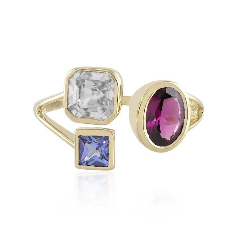 Entdecken Sie die moderne Eleganz dieses Rings aus 9-karätigem Gold, der mit einem auffälligen Umbalit aus Tansania, einem funkelnden Zirkon aus Kambodscha und einem königlichen Tansanit aus Tansania besetzt ist, die zusammen ein Gesamtkaratgewicht von 2,88 ergeben. Das geometrische Spiel von ovalen, oktagonalen und quadratischen Princess-Schliffen bildet eine harmonische Sinfonie der Formen und macht diesen Ring zu einem kunstvollen Statement-Stück. Dieses raffinierte Accessoire setzt die Bühne für Raffinesse bei jeder Veranstaltung und passt perfekt zu Ihrem Lieblingsabendkleid oder einem eleganten Freizeitoutfit.