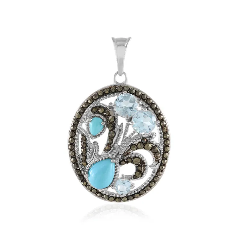 Entdecken Sie die Anziehungskraft dieses raffinierten Anhängers mit dem ikonischen Dornröschen-Türkis, gepaart mit funkelnden himmelblauen Topasen und glitzernden Markasiten, alles in Sterlingsilber gefasst. Der Anhänger bietet eine harmonische Farbmischung mit seinen faszinierenden himmelblauen Tönen vor dem Hintergrund des Sterlingsilbers. Er ist ideal, um jedem Outfit einen Hauch von Eleganz zu verleihen, und eignet sich für besondere Anlässe ebenso wie für das tägliche Tragen. Mit einem Gesamtgewicht von 2,808 ct und einem raffinierten Design ist dieses Schmuckstück ein Muss für Sammler und Modebegeisterte gleichermaßen.