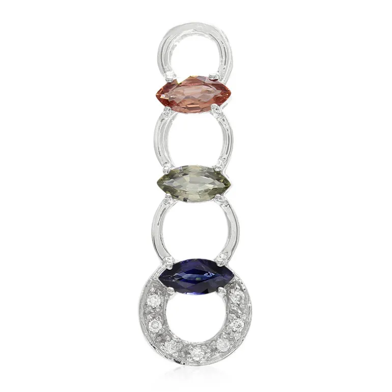 Entdecken Sie die Faszination dieses atemberaubenden Anhängers mit einem Trio von Saphiren im Marquiseschliff in den bezaubernden Farben Padparadscha, Grün und Blau, die alle aus den renommierten Minen von Sri Lanka, Madagaskar und Myanmar stammen. Ergänzt durch funkelnde Zirkon-Akzente aus Kambodscha, ist der Anhänger aus hochwertigem 925er Sterlingsilber mit einer luxuriösen Platinbeschichtung für einen dauerhaften Glanz gefertigt. Sein elegantes Design macht ihn vielseitig genug, um sowohl die Alltagskleidung als auch die Kleidung für besondere Anlässe aufzuwerten.