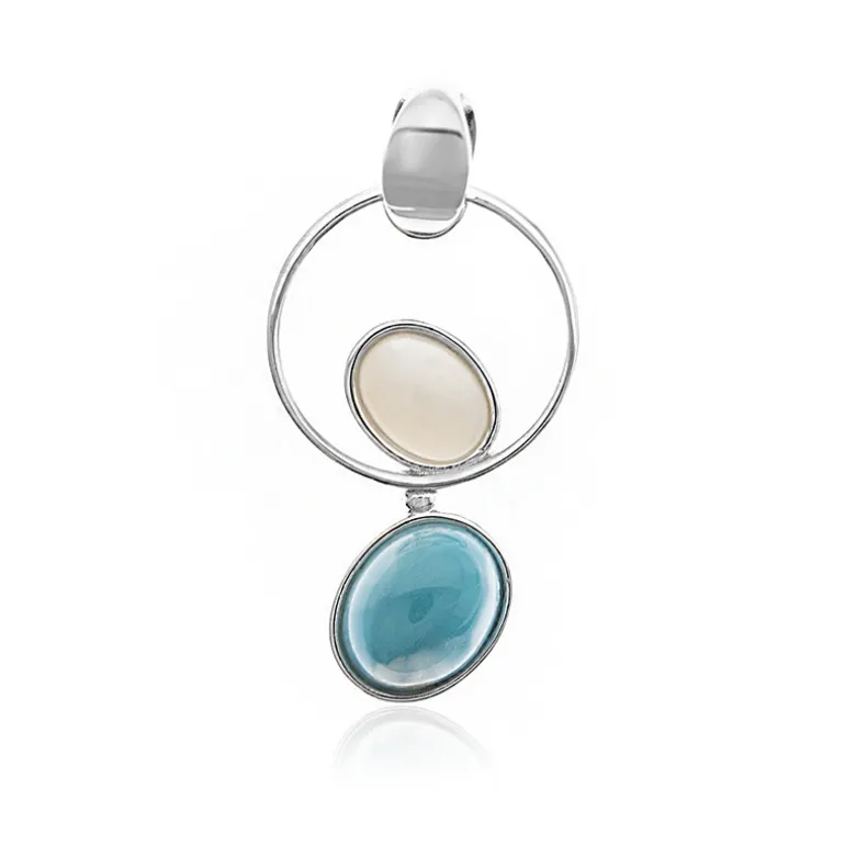 Entdecken Sie die ruhige Schönheit der Karibik mit diesem exquisiten Anhänger, der einen atemberaubenden ovalen 3-karätigen Larimar-Cabochon mit glänzendem Perlmutt kombiniert. Beide Edelsteine sind zart in 925er Sterlingsilber gefasst, was ihren natürlichen Charme unterstreicht. Das ungewöhnliche Design, das ein harmonisches Gleichgewicht suggeriert, ist perfekt, um sowohl Tages- als auch Abendgarderobe einen Hauch von Eleganz zu verleihen. Machen Sie dieses vielseitige Stück zum Mittelpunkt Ihrer Schmucksammlung.