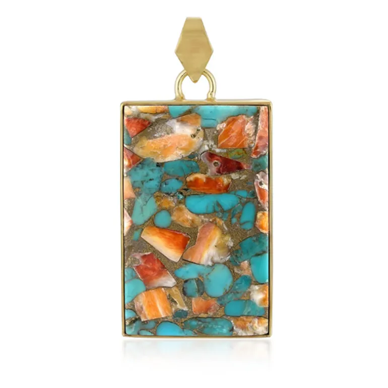 Entdecken Sie die bezaubernde Mischung aus blauem Kingman-Mohave-Türkis und leuchtend orangefarbener Auster in diesem atemberaubenden Silberanhänger. Das Mosaikdesign bietet eine einzigartige Ästhetik, die sowohl Schmuckliebhaber als auch Gelegenheitsbewunderer anspricht. Kombinieren Sie ihn mit einer schlichten Bluse, um im Büro einen Farbakzent zu setzen, oder tragen Sie ihn, um Ihre Abendgarderobe bei einem geselligen Beisammensein aufzuwerten. Dieses Stück ist eine vielseitige Ergänzung für jede Schmucksammlung.