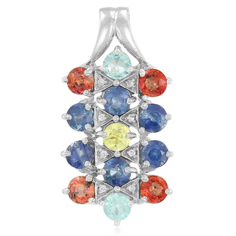 Tauchen Sie ein in die Welt der Farben mit diesem bezaubernden Anhänger aus 925er Sterlingsilber, der mit einem leuchtenden Mosaik aus Edelsteinen verziert ist. Mit einer sorgfältig ausgewählten Auswahl an Rubinen, Saphiren und Apatiten aus der ganzen Welt hat dieses Schmuckstück ein Gesamtgewicht von 3,13 Karat. Der strahlende Capelinha-Sphene in der Mitte wird durch die glitzernden Zirkone ergänzt, die ein bezauberndes Funkeln erzeugen, das perfekt für Dinnerpartys oder Galaveranstaltungen ist. Der runde Schliff jedes Steins maximiert die Brillanz, während die Platinbeschichtung einen Hauch von dauerhafter Eleganz verleiht. Lassen Sie diesen Anhänger Ihre Garderobe mit seiner exquisiten Farbpalette erstrahlen.