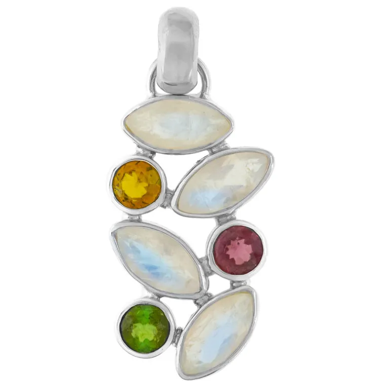 Dieser exquisite Anhänger zeigt die faszinierende Schönheit weißer Labradorit-Edelsteine aus Madagaskar, die durch leuchtend grüne, gelbe und rote Turmaline aus Pakistan hervorgehoben werden. Das elegante Design und das Gesamtgewicht von 5,5 Karat machen diesen Anhänger aus 925er Sterlingsilber zu einem echten Hingucker. Perfekt, um sowohl lässigen als auch formellen Outfits einen Hauch von Raffinesse zu verleihen, besonders ideal für Abendveranstaltungen.