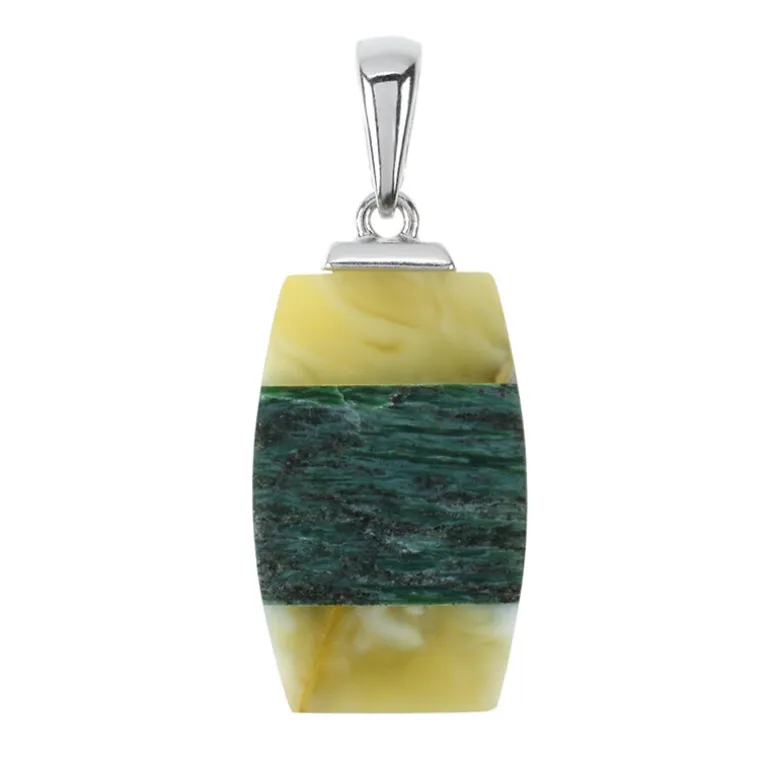 Entdecken Sie die nahtlose Verschmelzung natürlicher Eleganz mit diesem Mosaik-Anhänger, der den lebhaften Kontrast von baltischem Bernstein und grünem Fuchsit zeigt. Die harmonische Kombination aus warmen Honigtönen und üppigen grünen Mustern sorgt für eine fesselnde Ästhetik. Dieser Anhänger ist ideal, um Ihrer Garderobe einen Hauch von naturinspirierter Raffinesse zu verleihen. Er lässt sich wunderbar mit erdigen Tönen und neutralen Outfits kombinieren und ist ein vielseitiges Accessoire für legere und formelle Anlässe.