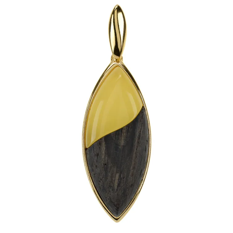 Entdecken Sie die bezaubernde Verbindung natürlicher Elemente in diesem vergoldeten Anhänger aus 925er Sterlingsilber. Der 5,65-karätige polierte baltische Bernstein bildet zusammen mit der zeitlosen Mooreiche eine fesselnde Marquise-Cabochon-Silhouette, die Harmonie mit der Natur symbolisiert. Das warme Leuchten des aus Polen stammenden Bernsteins wird durch die erdigen Töne der Eiche ergänzt, was ihn vielseitig für jede Gelegenheit einsetzbar macht. Er ist ideal, um Ihrer Garderobe einen Hauch von organischer Eleganz zu verleihen, ein Gesprächsanlass bei gesellschaftlichen Anlässen oder ein einzigartiges Geschenk für einen geliebten Menschen.