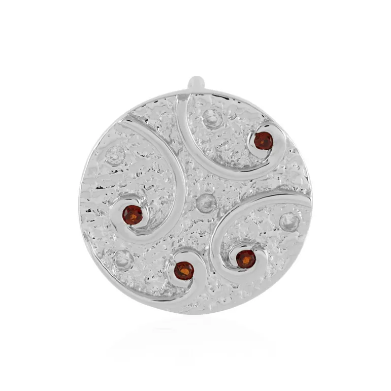 Entdecken Sie die Faszination dieses modernen Anhängers mit einem Quartett indischer Granate und einem Quintett kambodschanischer Zirkone, die alle sorgfältig rund geschliffen sind, um ihr bezauberndes Funkeln zu betonen. Der Anhänger ist aus hochwertigem 925er Sterlingsilber mit einer luxuriösen Platinbeschichtung gefertigt und wiegt etwa 4,32 Gramm. Sein einzigartiges, wirbelndes Muster macht ihn zu einem außergewöhnlichen Schmuckstück. Dieser Anhänger eignet sich perfekt, um jedem Outfit einen Hauch von Eleganz zu verleihen, und lässt sich nahtlos von der Tagesgarderobe bis zum glamourösen Abend tragen.