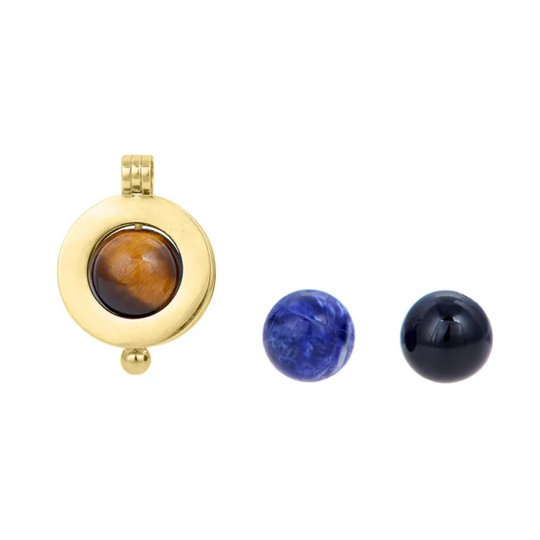 Entdecken Sie die Faszination dieses einzigartigen, austauschbaren Anhängers mit einer exquisiten Auswahl an Edelsteinen im Rundschliff: der tiefe Reiz des Onyx, das ruhige Blau des Sodaliths und die fesselnden Bänder des Tigerauges, jedes mit einem Gewicht von über 11 Karat aus Brasilien und Südafrika. Die Basis aus 925er Sterlingsilber, das in eine üppige Goldplattierung getaucht ist, bietet dauerhafte Qualität und einen Hauch von Eleganz. Dieser Anhänger ist ideal für den Übergang von der Tages- zur Abendgarderobe und lässt sich mühelos mit verschiedenen Outfits kombinieren, was ihn zu einer vielseitigen Ergänzung für jede Schmucksammlung macht.
