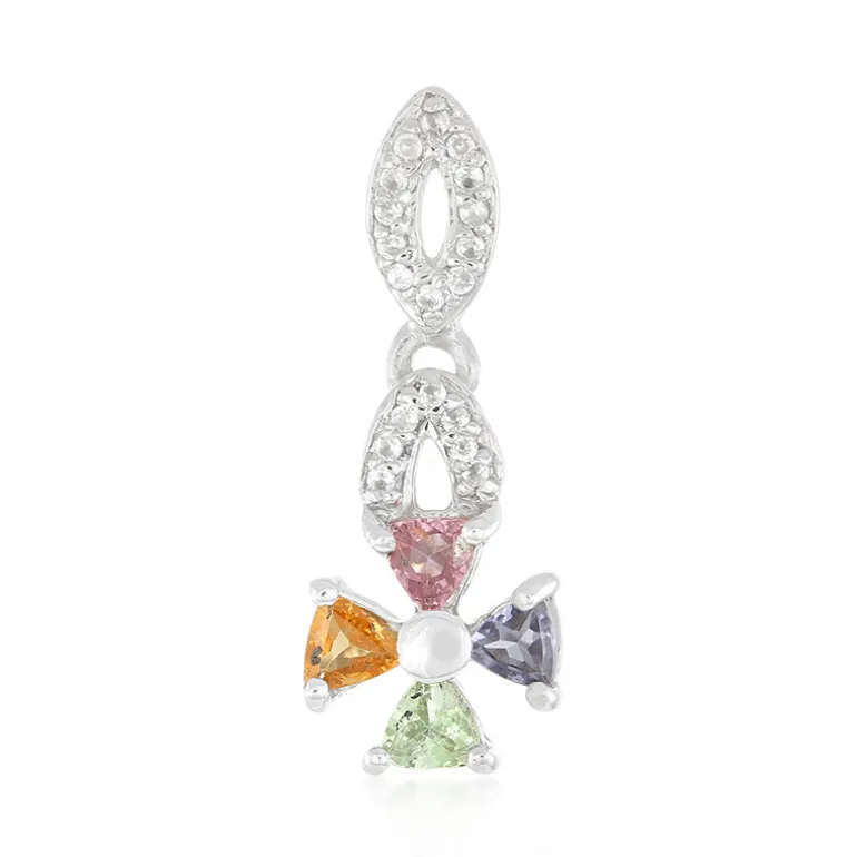 Dieser exquisite Anhänger besticht durch eine Vielzahl von Edelsteinen, darunter ein rosafarbener Kupferturmalin aus Mosambik, ein Tansanit aus Tansania, ein brasilianischer Paraiba-Turmalin und ein nigerianischer AAA-Spessartit im Billionenschliff. Mit runden Zirkon-Akzenten bietet dieses platinierte Silberstück ein Kaleidoskop an Farben und Eleganz. Perfekt, um Alltagsoutfits aufzuwerten oder besonderen Anlässen Glanz zu verleihen.