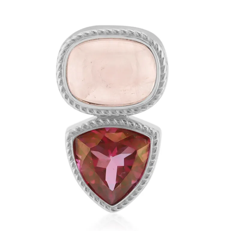 Entdecken Sie die Eleganz dieses bezaubernden Silberanhängers mit einem 6,12-karätigen Rosenquarz aus Indien, der mit einem 6,908-karätigen rosa Topas aus Nigeria gepaart ist. Der antike Cabochon und der Trillium-Schliff bieten eine Mischung aus klassischem und modernem Stil, gefasst in 925er Sterlingsilber. Er eignet sich sowohl für legere als auch für formelle Anlässe und wertet jedes Outfit mit seinen sanften Farbtönen und seinem exquisiten Design auf.