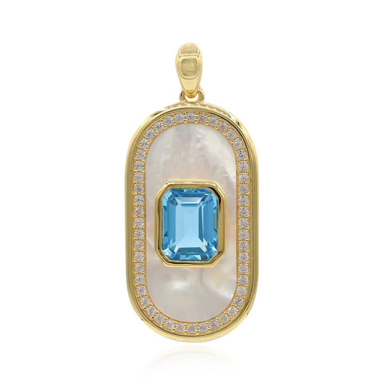 Dieser exquisite Anhänger präsentiert eine Mischung aus Opulenz und moderner Eleganz. Den Anfang macht ein leuchtendes Stück neuseeländisches Perlmutt in einer Fassung aus vergoldetem 925er Sterlingsilber. Das Herzstück ist ein Marambaia-Topas aus Brasilien mit 2,538 Karat, der in einer königlichen Achteckform geschliffen und von 48 funkelnden Zirkonsteinen aus Kambodscha mit insgesamt 0,562 Karat umgeben ist. Mit einem Gewicht von ca. 4,99 g und einer Größe von 37 x 17 mm ist dieser Anhänger ein Blickfang für festliche Anlässe oder ein raffiniertes Accessoire für die Bürogarderobe.