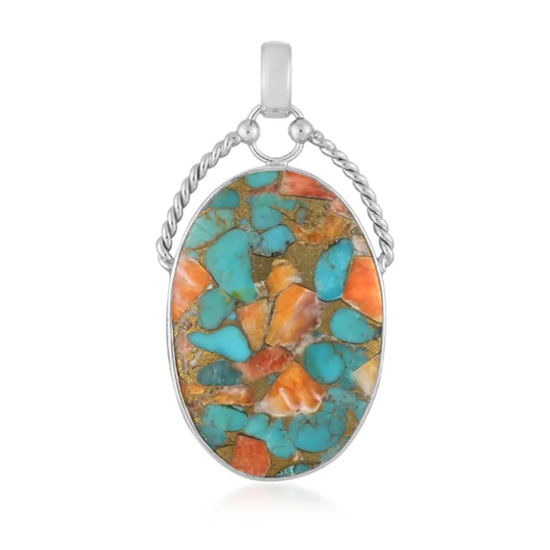Entdecken Sie die exquisite Mischung aus blauem Kingman-Mohave-Türkis und leuchtend orangefarbener Spiny Oyster in diesem atemberaubenden Silberanhänger. Das Mosaikdesign bietet ein einzigartiges künstlerisches Flair und macht ihn zu einem herausragenden Stück für jede Schmucksammlung. Er eignet sich perfekt als Farbakzent für Freizeitoutfits oder zur Aufwertung eleganter Ensembles für besondere Anlässe. Erhöhen Sie Ihren Stil mit diesem fesselnden Anhänger.