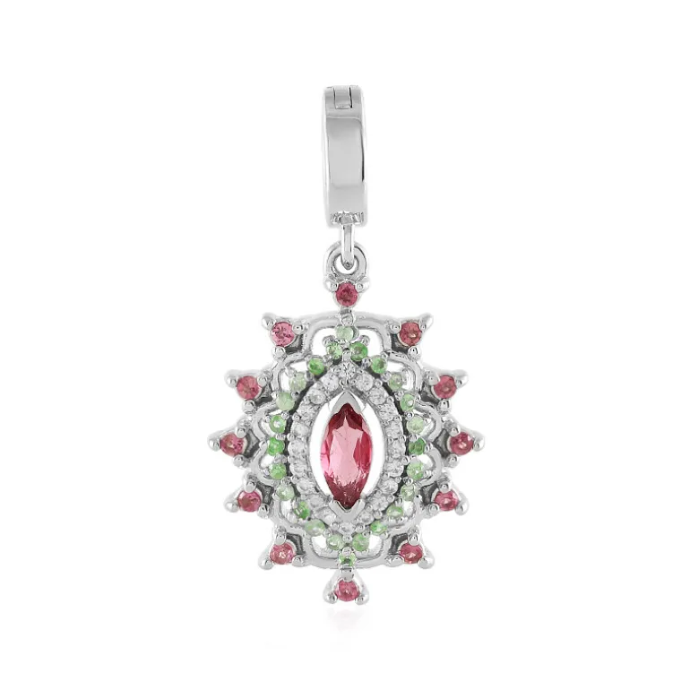 Entdecken Sie die bezaubernde Mischung aus leuchtenden Farbtönen mit diesem atemberaubenden Anhänger, dessen Herzstück ein rosa Turmalin im Marquiseschliff (0,198 ct) ist, der von einer Reihe von Turmalinen und Tsavoriten im Rundschliff aus Tansania ergänzt wird. Das glänzende 925er Sterlingsilber, das mit Platin überzogen ist, verstärkt das Funkeln der einzelnen Edelsteine an diesem exquisiten Stück. Der vielseitig einsetzbare Vario-Clip verleiht dem Schmuckstück einen bezaubernden Glanz, während es anmutig baumelt. Dieser Anhänger ist eine luxuriöse Ergänzung für jedes Ensemble und wird bei jeder Gelegenheit die Blicke auf sich ziehen.