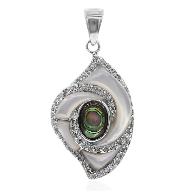 Entdecken Sie die marmorierte Eleganz dieses raffinierten Anhängers aus Perlmutt und Abalone, der in hochwertigem 925er Sterling Silber gefasst ist. Der Anhänger besteht aus Perlmutt und Abalone aus China und ist mit schimmernden weißen Topasen von insgesamt 0,935 Karat aus Nigeria besetzt. Jede anmutige Kurve ist so gestaltet, dass sie das Licht einfängt, und weist eine künstlerische Anordnung auf, die natürliche Muster widerspiegelt. Er eignet sich sowohl für legere als auch für formelle Anlässe und wertet jedes Outfit mit seinem ozeanischen Charme auf.