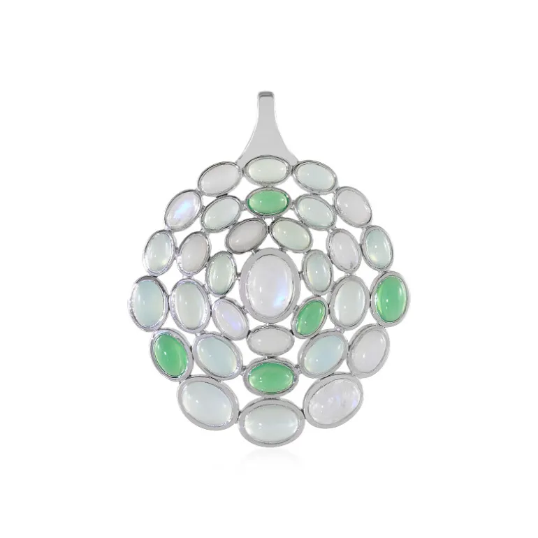 Dieser exquisite Anhänger besteht aus 25 Edelsteinen, darunter ein faszinierender Regenbogenmondstein und ein leuchtender Chalcedon, gefasst in glänzendem 925er Sterlingsilber. Mit einem bemerkenswerten Gesamtgewicht von 13,68 ct fängt er ein atemberaubendes Farbenspiel ein. Er ist ideal, um formellen Anlässen einen Hauch von Eleganz zu verleihen, aber auch um lässigen Ensembles ein einzigartiges Flair zu verleihen. Perfekt für den Alltag und besondere Anlässe.