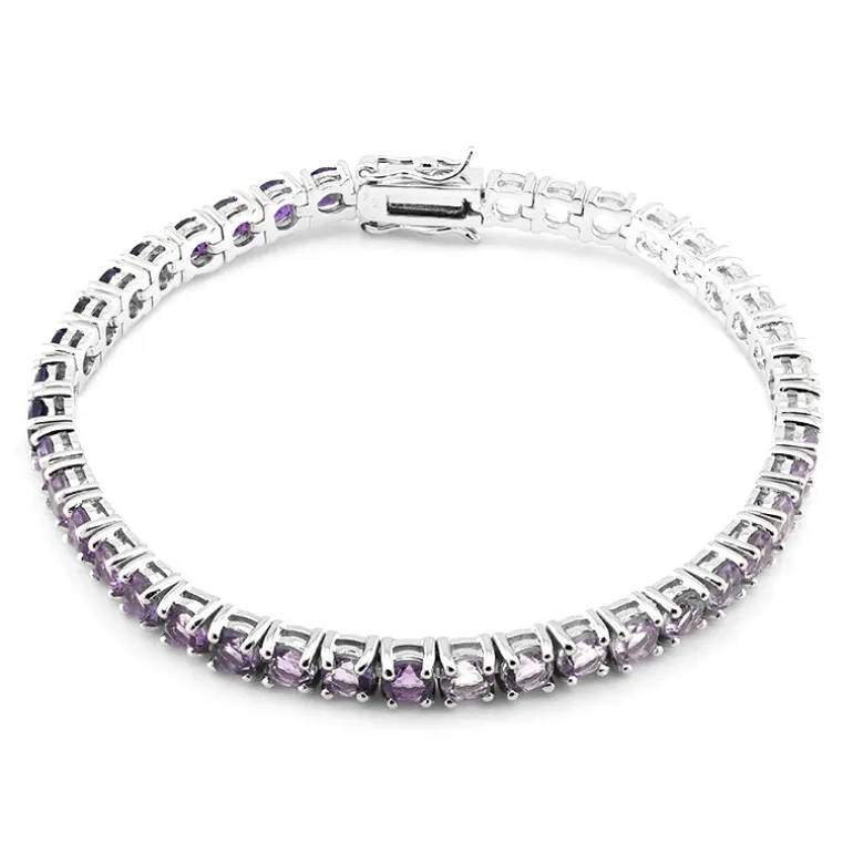 Dieses exquisite Armband kombiniert die Anziehungskraft von Amethysten aus Bolivien, Brasilien und Sambia mit dem Funkeln von weißen Topasen aus Nigeria. Das 18,5 cm lange Armband ist in 925er Sterlingsilber gefasst und strahlt Eleganz aus. Mit einem Gesamtkaratgewicht von 9,558 ct verleiht es jedem Outfit einen Hauch von Raffinesse und eignet sich sowohl für formelle Anlässe als auch für legere Eleganz.