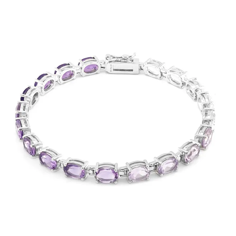 Dieses exquisite Armband ist aus 925er Sterlingsilber gefertigt und zeigt eine atemberaubende Kombination aus leuchtenden Amethysten und eleganten weißen Topasen. Die oval geschliffenen Edelsteine aus Nigeria, Bolivien, Brasilien und Sambia haben ein Gesamtgewicht von 13,057 Karat. Dieses Armband eignet sich sowohl für legere als auch für elegante Anlässe und lässt sich wunderbar mit Abendgarderobe kombinieren, um Ihrem Ensemble einen Hauch von Raffinesse und Farbe zu verleihen.