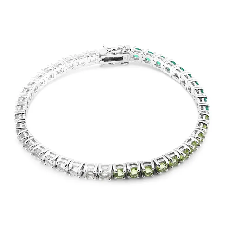 Dieses exquisite Armband präsentiert eine Reihe von Edelsteinen, die nigerianischen weißen Topas, burmesischen Peridot, brasilianischen grünen Amethyst und indischen grünen Achat kombinieren. Das Gesamtgewicht des in 925er Sterlingsilber gefassten Armbands beträgt 9,702 Karat. Dieses Schmuckstück eignet sich sowohl für legere als auch für formelle Anlässe und passt sowohl zu eleganter Abendgarderobe als auch zu schickem Tagesoutfit und verleiht jedem Ensemble einen Hauch von Raffinesse.