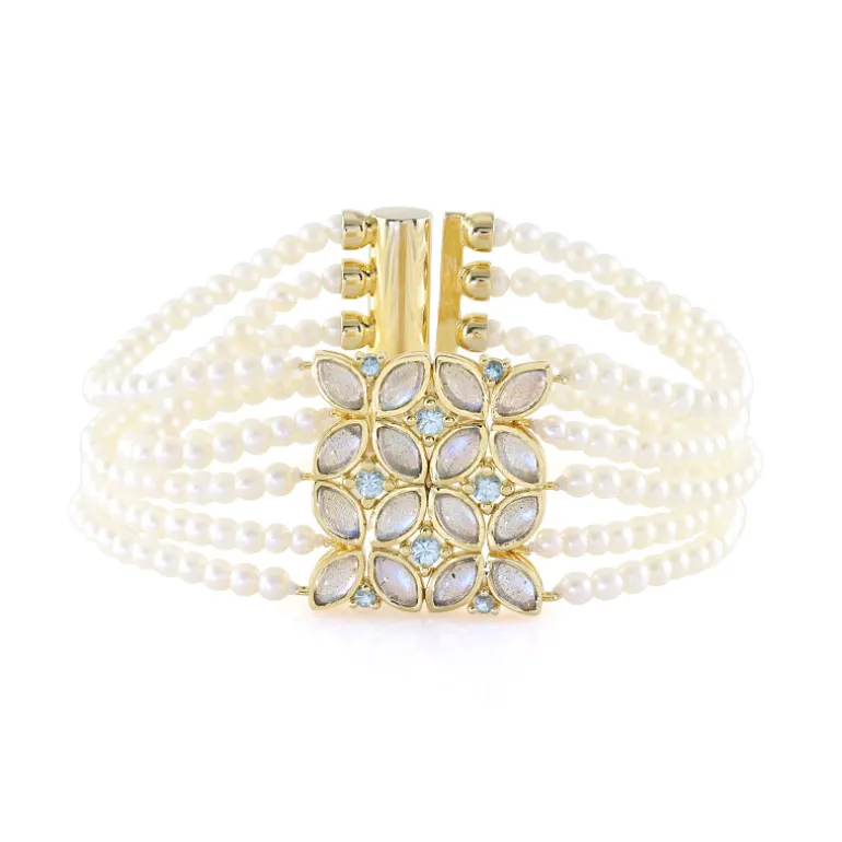 Dieses Armband von KM by Juwelo vereint die exotische Anziehungskraft des blauen Labradorits aus Madagaskar mit der zeitlosen Eleganz der weißen Süßwasserperlen aus China. Hüllen Sie Ihr Handgelenk in die luxuriöse Umarmung mehrerer Stränge, die mit 4,32 Karat Labradorit-Cabochons in Marmorform geschmückt sind und von 0,792 Karat kambodschanischem Ratanakiri-Zirkon-Funkeln akzentuiert werden. Dieses Armband aus reichlich vergoldetem 925er Sterlingsilber ist der Inbegriff von Raffinesse. Kombinieren Sie es mit einem Cocktailkleid für eine Gala oder verleihen Sie Ihrem Alltagsoutfit einen Hauch von Glamour.