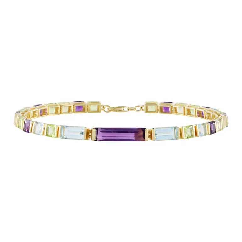 Entdecken Sie die Eleganz dieses mehrreihigen Armbands mit brasilianischem Amethyst, Topas und chinesischem Peridot, alle wunderschön gefasst in vergoldetem 925er Sterling Silber. Mit einem Gesamtgewicht von 14,283 ct ist dieses 19,5 cm lange Armband perfekt, um jedem Outfit einen Hauch von Luxus zu verleihen. Ideal für abendliche Anlässe oder zur Aufwertung Ihres Alltagslooks. Lassen Sie seine leuchtenden Farben und sein raffiniertes Design zum Highlight Ihrer Schmucksammlung werden.