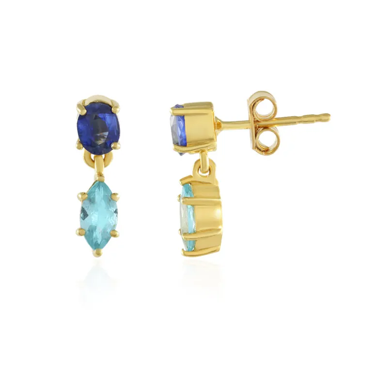 Entdecken Sie die Eleganz dieser exquisiten Ohrringe mit atemberaubenden blauen Apatiten aus Brasilien und tiefen Kyaniten aus Nepal. Das raffinierte Design dieser Ohrringe aus vergoldetem Sterlingsilber kombiniert Marquise und Oval mit einem Gesamtgewicht von 1,371 ct. Diese 15 mm großen Ohrringe eignen sich perfekt für Abendveranstaltungen oder einen eleganten Tagesausflug und verleihen jedem Outfit einen strahlenden Touch.