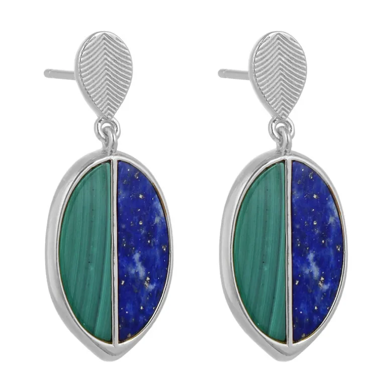 Diese atemberaubenden Ohrringe aus 925er Sterlingsilber zeigen eine schicke Kombination aus Malachit und Lapislazuli, die im Fancy-Schliff zu einem kunstvollen Paar geschliffen wurden. Der grüne Malachit aus der Demokratischen Republik Kongo und der himmlische Lapis aus Afghanistan wiegen zusammen 3,2 Karat und werden von einer eleganten Silberfassung umschlossen. Jeder Ohrring misst ca. 31 mm und ist damit sowohl für den Alltag als auch für besondere Anlässe geeignet. Kombinieren Sie sie mit einem eleganten Freizeitoutfit für einen gehobenen Look oder mit Abendkleidung für einen Hauch von Raffinesse.