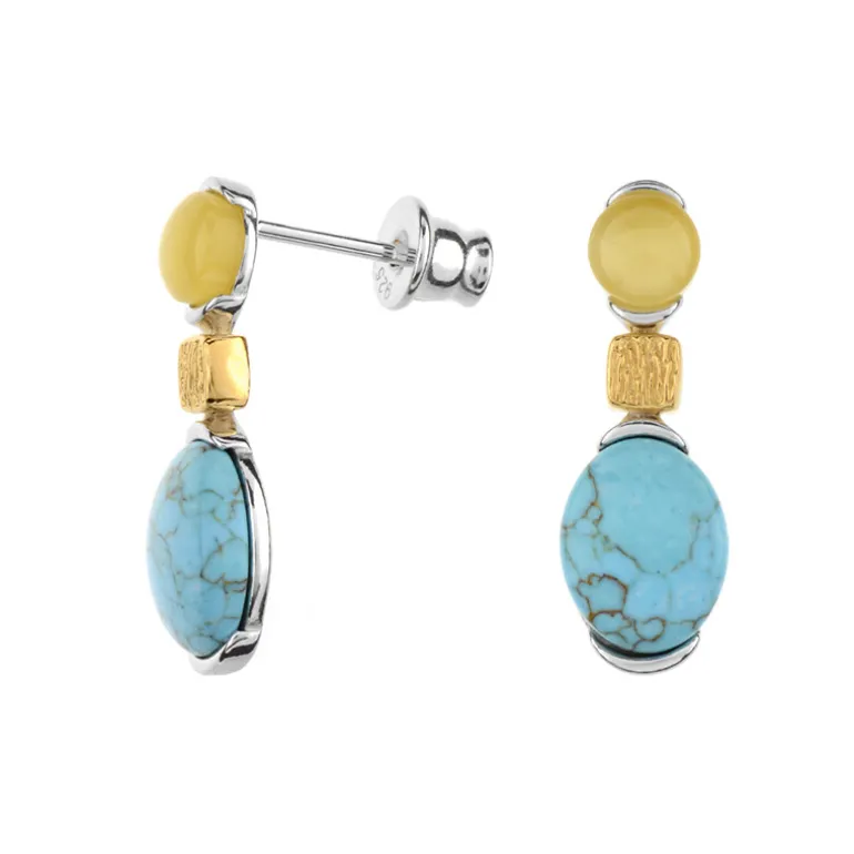 Entdecken Sie die Eleganz dieser atemberaubenden Ohrringe mit lebhaftem USA-Türkis und warmem baltischem Bernstein. Die ovalen und runden Cabochons sind elegant in 925er Sterlingsilber gefasst. Diese Ohrringe sind ideal, um jedem Outfit einen Hauch von Raffinesse zu verleihen, und eignen sich sowohl für den Alltag als auch für besondere Anlässe. Kombinieren Sie sie mit legerer oder formeller Kleidung für einen eleganten und polierten Look.