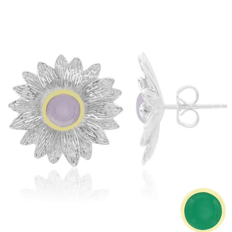 Lassen Sie sich vom Charme der Natur verzaubern mit diesen floral inspirierten Ohrringen aus Sterlingsilber, die mit zarten Cabochons aus lavendelfarbener Jade und grünem Chalcedon von insgesamt 1,622 Karat geschmückt sind. Die Edelsteine sind wunderschön in gelb- und weißvergoldetes 925er Silber gefasst und bilden einen frischen und lebendigen Kontrast. Diese vielseitigen Ohrringe sind ideal für einen eleganten Auftritt am Tag oder ein dezentes Funkeln am Abend und verleihen Ihrer Kleidung einen Hauch von Frühling, egal zu welcher Jahreszeit.