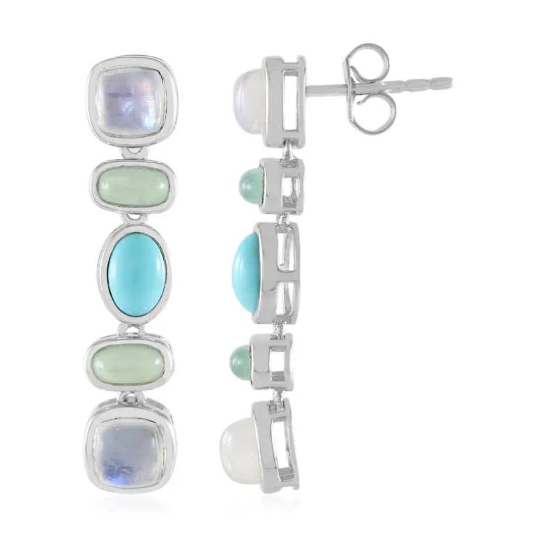 Diese raffinierten und lebhaften Ohrringe sind mit Dornröschen-Türkisen aus den USA besetzt, die durch blaue Mondsteine und grünen Chalzedon aus Indien ergänzt werden. Sie sind aus 925er Sterlingsilber gefertigt und haben ein Gesamtkaratgewicht von 5,22. Perfekt für lässige Ausflüge oder elegante Abende. Kombinieren Sie sie mit einem fließenden Kleid oder einer schicken Bluse für einen Hauch von zeitloser Eleganz.