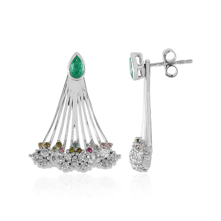 Unsere auffälligen Tropfenohrringe sind mit kolumbianischen Smaragden verziert, die von einer funkelnden Kaskade kambodschanischer Zirkone und lebhafter Turmaline aus Madagaskar ergänzt werden. Die aus platiniertem 925er Sterlingsilber gefertigten Ohrringe haben ein Gesamtkaratgewicht von 2,375 ct. Das schlanke Design in Tropfenform in Kombination mit dem Farbklecks macht sie vielseitig einsetzbar, sowohl für den Tag als auch für die Abendgarderobe. Mit dieser bezaubernden Ergänzung können Sie jedes Ensemble aufpeppen.